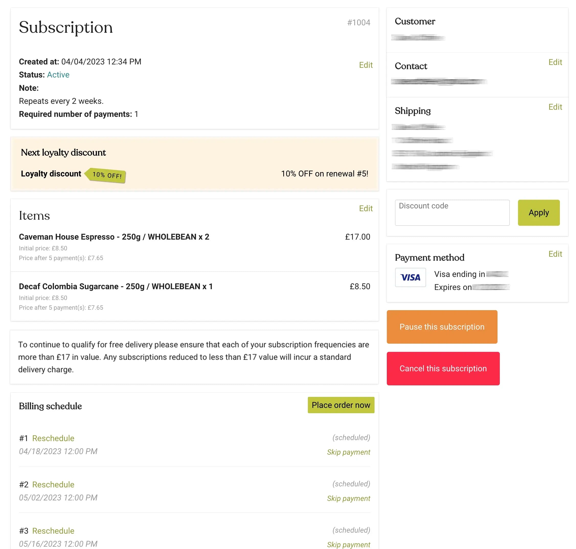 Subscriptions are automatically renewed according to your selected delivery interval and your coffee will be automatically delivered by the roastery after each successful renewal.